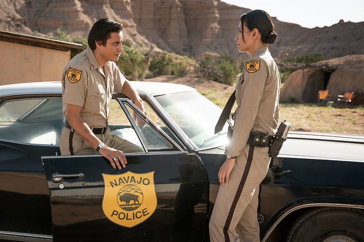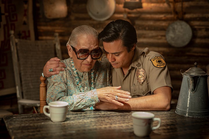In all of the danger, Kiowa Gordon delivers one of his most powerful performances yet as Chee opens up to Bernadette about the death of his mother and places blame upon himself for abandoning his Navajo heritage—refusing her request for him to take her back to the reservation during her final days.