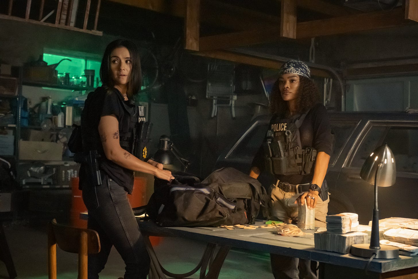 This is a cop thriller built not on countless car chases or running down bad guys over sprawling cityscapes, but on claustrophobia. Tight locations—stash houses, tankers, rooms with no exits—become emotional pressure chambers where trust erodes faster than a snow cone in July. Every glance means something. Every silence is suspicious. And every choice feels like it will cost everyone their life.